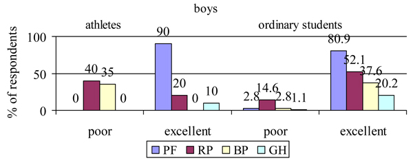 As you can see from the present chart (fig. 1), in 90% of cases the involved-in-sports students get high indicators of QoL, in terms of PF scale. But against this backdrop, in comparison with the students not involved in sports, low indicators of such physical state scales, such as RP and "bodily pain" (BP), occur markedly more often: 40 vs. 14.6% (p 0.01) and 35 vs. 2.8% (p 0.01) respectively. What's more about the same scales, high indicators (excellent QoL) are less likely to occur for athletes: 20 vs. 52.1% (p 0.01) and 0 vs. 37.6% (p 0.001) respectively.