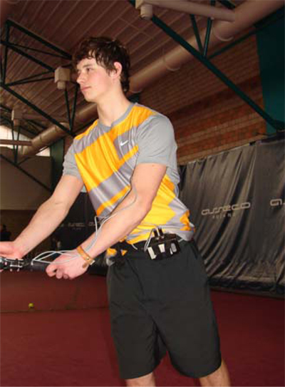 Fig. 4. Tennis player equipped with a device of serve strength measurement