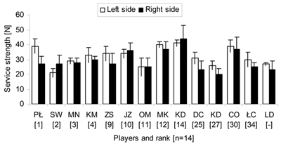Most players in our group were characterized by greater values of strength when serving into the left service box. This was specific of right-handed athletes who constituted marked majority of the examined group. Plausibly, this is determined by varying angle of the shot typical for right- and left-handed tennis players. Observations suggest that left-handed players who serve into the right service box are more predisposed to direct the ball outside the court. This situation is particularly favorable during games with right-handed competitors when the ball is directed onto the backhand – a shot usually less effective in most athletes. In this study, no significant differences of strength were documented between serves directed into opposite service boxes; however, we observed a marked variability of individual results. It should be noted that although the ranking is a complex derivative of the sports level and activity of an athlete, it does not necessarily correspond to his/her actual disposition.