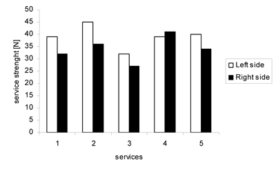 The mean value of dynamic strength developed during the serve into the left box amounted to M±SD=32.0±.0.6 N, with individual measurements ranging between 21.0 N and 41.0 N. The value of the dynamic strength of the serve into the right box was M±SD= 29.0±0.7 N on average, with individual variability between 20.0 N and 44 N. Most athletes were characterized by higher strength of the serve placed into the left service box. However, no significant differences of strength were documented between serves directed into opposite service boxes (Fig. 5).