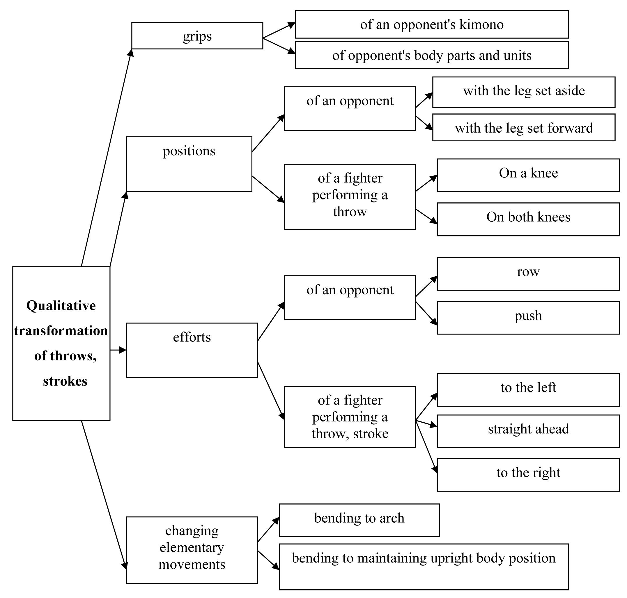 During the quantitative transformation of a throw (stroke) the number of elementary movements, its constituents, varies. There were defined transformations of a throw (stroke) in case of: 1) different reactions of an opponent; 2) fighter changing to perform other throws (strokes) (Fig. 2).