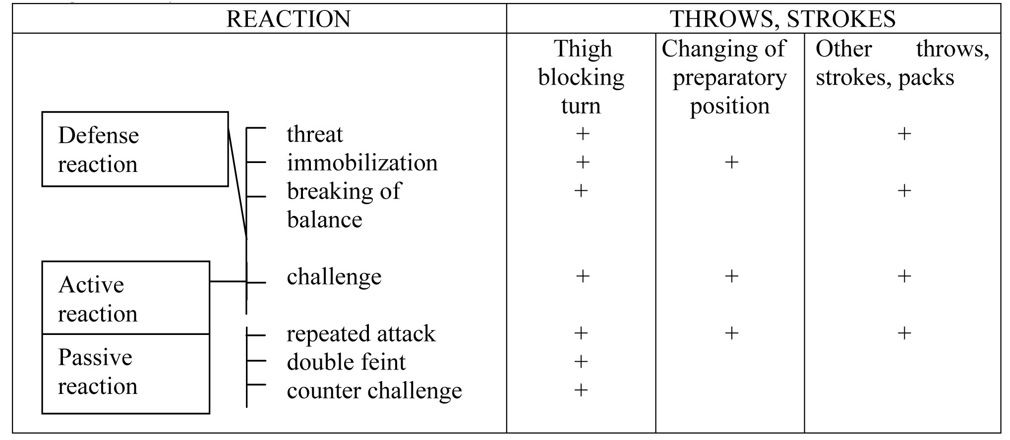 Table 1. Transformation of throws, strokes during various reactions of an opponent (quantitative transformation)