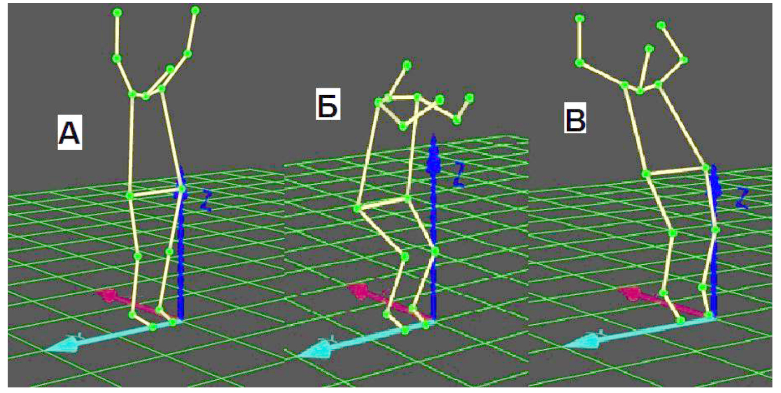 Results and discussion. The following major phases were singled out while analyzing the biomechanical structure of a standing somersault: the preparatory phase – a movement from the starting position of standing on straight legs downward (squatting) (Figure 1 – А), the start of which is defined as downward movement of the trochanteric fossa; the main phase – legs extension and flying upwards taking a tuck position or jumping characterized by an upward movement of the trochanteric fossa (Figure 1 – B); the final phase – opening of the body and landing determined by a downward movement of the trochanteric fossa. The main phase in turn is divided into two stages – a take-off and flying upwards, bordering at the moment when feet’s contact with the supporting surface comes to an end (Figure 1 – C), and the start of the flight is associated with the start of the movement of the “final” point on the feet.