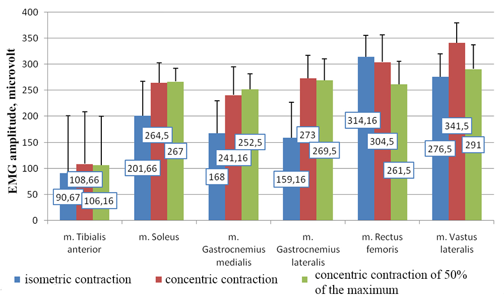 The amount of muscle effort was determined by the amplitude of their electrical activity recorded directly during the performance of the above movements using a 16-channel telemetric electromyograph "ME6000". Electromyogram for 6 pairs of lower limb muscles was recorded: tibialis anterior muscle (m. Tibialis anterior), soleus muscle (m. Soleus), gastrocnemius (m. Gastrocnemius) medial (medialis) and vastus lateralis (lateralis) as well as rectus femoris (m. Rectus femoris) and vastus external muscle (m. Vastus lateralis).