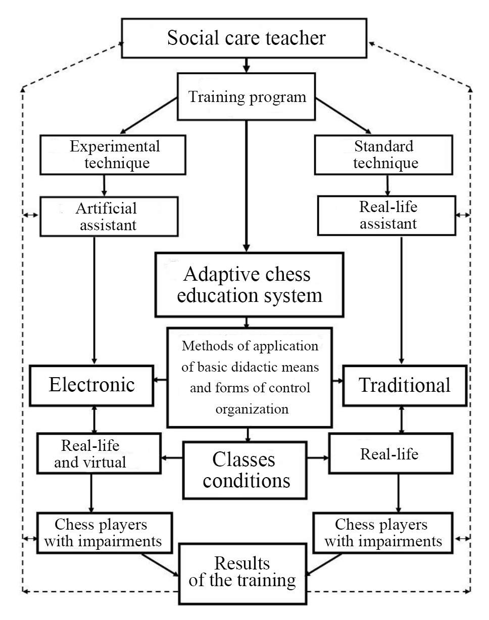 Teaching the basics of adaptive chess sport can also be carried out remotely, by means of programmed learning using audio-visual information and communication technologies (ICT), which is schematically shown in the left column. Complex usage of remote and traditional forms of teaching is also possible.