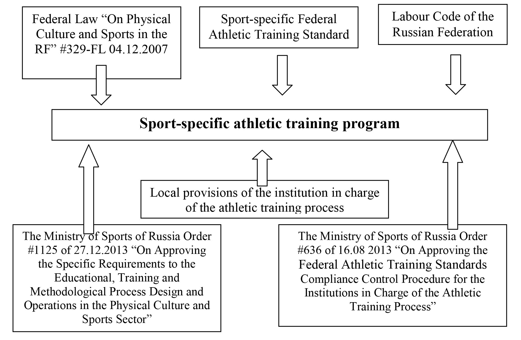 Furthermore, acting pursuant to the Laws of the Russian Federation, the national Ministry of Sports issued a few orders to regulate operations of the national sport school system. Given on Figure 2 hereunder are the key orders that regulate the athletic training programming process. The key point of the new sport reserve training system is that the whole training process will be governed by the relevant Federal Athletic Training Standards specific for the sport discipline [4]. It is based on these standards and the package of the relevant legal and regulatory documents that every relevant institution in charge of the athletic training process shall develop its local regulations for the local athletic training program development and implementation initiatives.