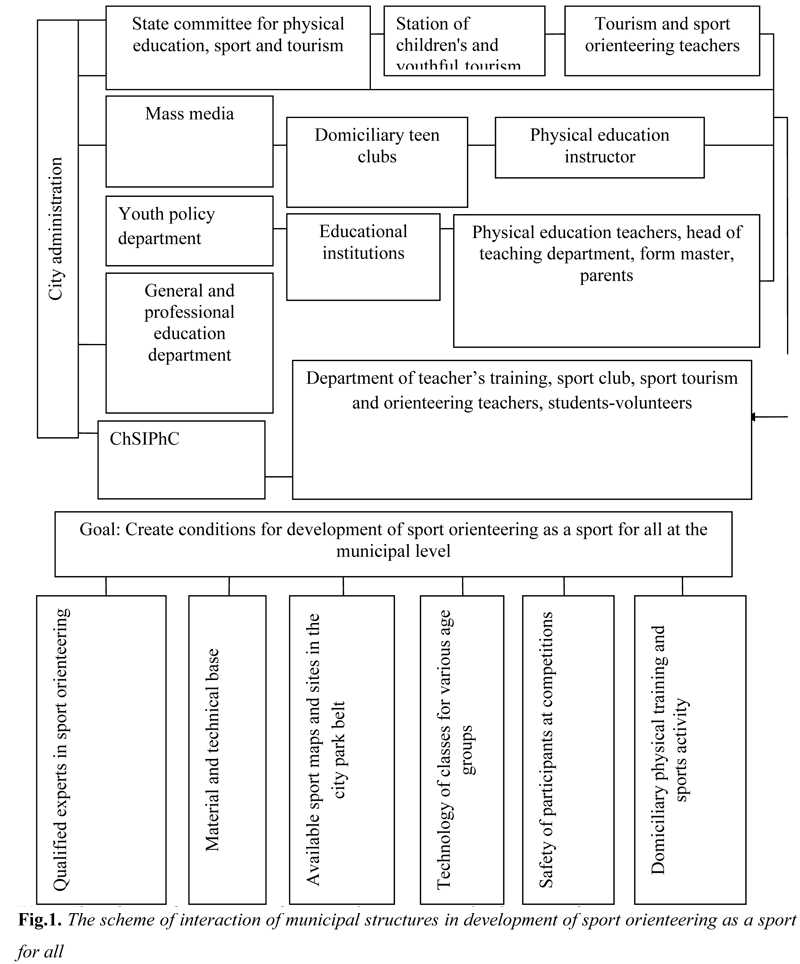 Introduction. Sport orienteering belongs to mass sports and has been gaining popularity among people in the last years. The recreational efficiency of these classes has been confirmed by numerous researches [1,4]. But, notwithstanding that, problems exist, making it complicated to develop sport orienteering as a sport for all. First of all, there is a lack of science-based organizational and educational conditions to form the basic knowledge and skills of sport orienteering, weak scientific and methodological development of available orienteering modifications, that make it possible for various socio-demographic groups to participate in mass competitions [1,3,5]. At the theoretical-practical congress ”National health and mass sport” Dr.Hab, professor S.P. Evseev made a report “Innovation development of mass sport and sports science”, where he revealed his personal idea of the correlation of national health and mass sport. He marked that health is not always the value for a healthy man and, thus, in the insufficient degree serves a stimulus for young people who do not have serious health problems yet. In other words, health is important not as it is, but as a way to achieve success in life in the area which an individual considers as such for himself [2]. The main principle in our study was the personality-centered approach, where conditions for involving in sport orienteering classes of various socio-demographic groups are created at the municipal level.