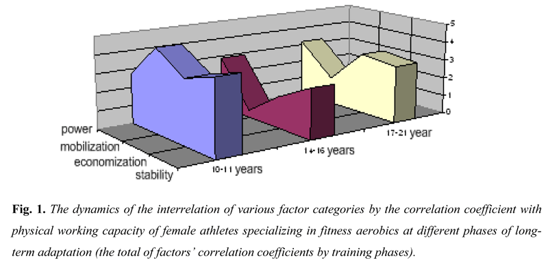 Hence, the level of physical working capacity is defined by numerous characteristics of functional impact of physiological body systems at different phases of long-term training in fitness aerobics. So at the phase of initial training, physical working capacity is stipulated by the maximum capacity of skeletal muscles, strength of nervous system and blood circulatory performance. At the phase of sports perfection these are the characteristics of physical development and strength of CNS nervous processes of female athletes that determine physical working capacity. The high level of physical working capacity at the elite sports phase is provided by the cardiac forcing function and pulmonary development.