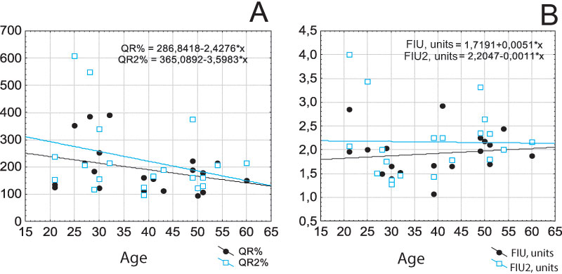 Results and discussion. The conducted study revealed that the Romberg’s coefficient after RG (QR2) in women at the age range from 20 to 60 years decreases compared to the beginning of trainings (QR) and can be described by the dependences of the types: QR = 287-2,47X and QR2 = 365-3,98X (Fig. А), (T). The decrease of the value of the Romberg’s coefficient indicates to the decrease of the load on the visual analyzer and increase of the functional state of proprioceptive and vestibular systems. The index of the balance function, on the contrary, increased after rehabilitation games on the platform (Fig. B) (Table).