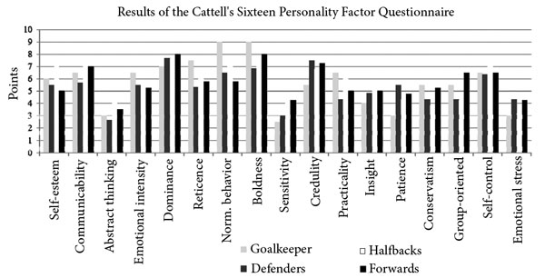 It has been proved that goalkeepers are more restraint (percentile > 0,75) unlike in other positions. Forwards have low self-appraisal, which is not typical for defenders and halfbacks. Defenders and halfbacks have maximally expressed credulity that testifies to excessive defense and emotional stress and frustration of personality.