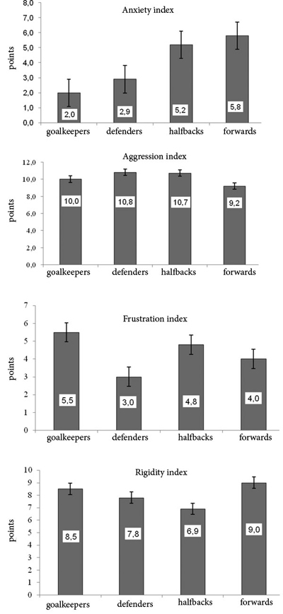Proceeding from the results of the Eysenck Personality Inventory, forwards and halfbacks have the top scores in the anxiety and rigidity indices, and goalkeepers - in the frustration and rigidity indices (Fig. 1.).