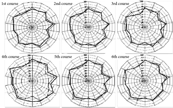 Despite the fact that tables are usually not very obvious, the original differences of self-appraisal of freshmen and the gradual elimination of these differences until the final years of study can be marked. Moreover, these differences are more quantitative rather than qualitative, and the similarity between the faculties becomes even more apparent when comparing the graphic profiles of creative potential, presented in Figure. We emphasize that both the differences between the departments and between courses are insignificant, i.e. the situation with the students’ creative potential in sports and non-sports departments does not change fundamentally during all the years of study.