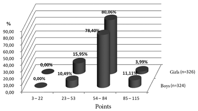Thus, 11.11 % among the first and fourth-year male respondents and 3.99 % among the girls gained the maximum number of points that reflect the level of sports activity (Fig. 1). The points of others are not enough to this important state of a mature man.