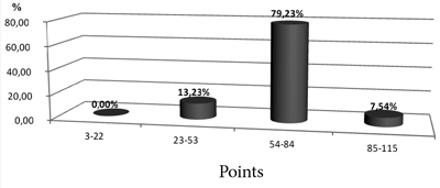 As a result of responses to the questionnaire student could earn a certain number of conventional points, namely: 3 - 22 - bad, 23 - 53 – average, 54 - 84 - good and 85 - 115 points - excellent. In this case, "excellent" mark matched with active participation in self-care, which is reliably qualified as sports activity. It is a state (not just "know" and "know how", but also regularly "do" what is important to maintain health), regarded as the desired end result of the efforts of physical education departments and the staff of three mentioned universities.