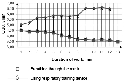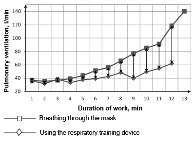 The efficiency of using the respiratory training device is illustrated by the graphs of changes in pulmonary ventilation, oxygen utilization rate and respiratory coefficient during exercise on a bicycle ergometer with an ever-increasing power (cadence - 80 rev/min) (Fig. 4, 5, 6).