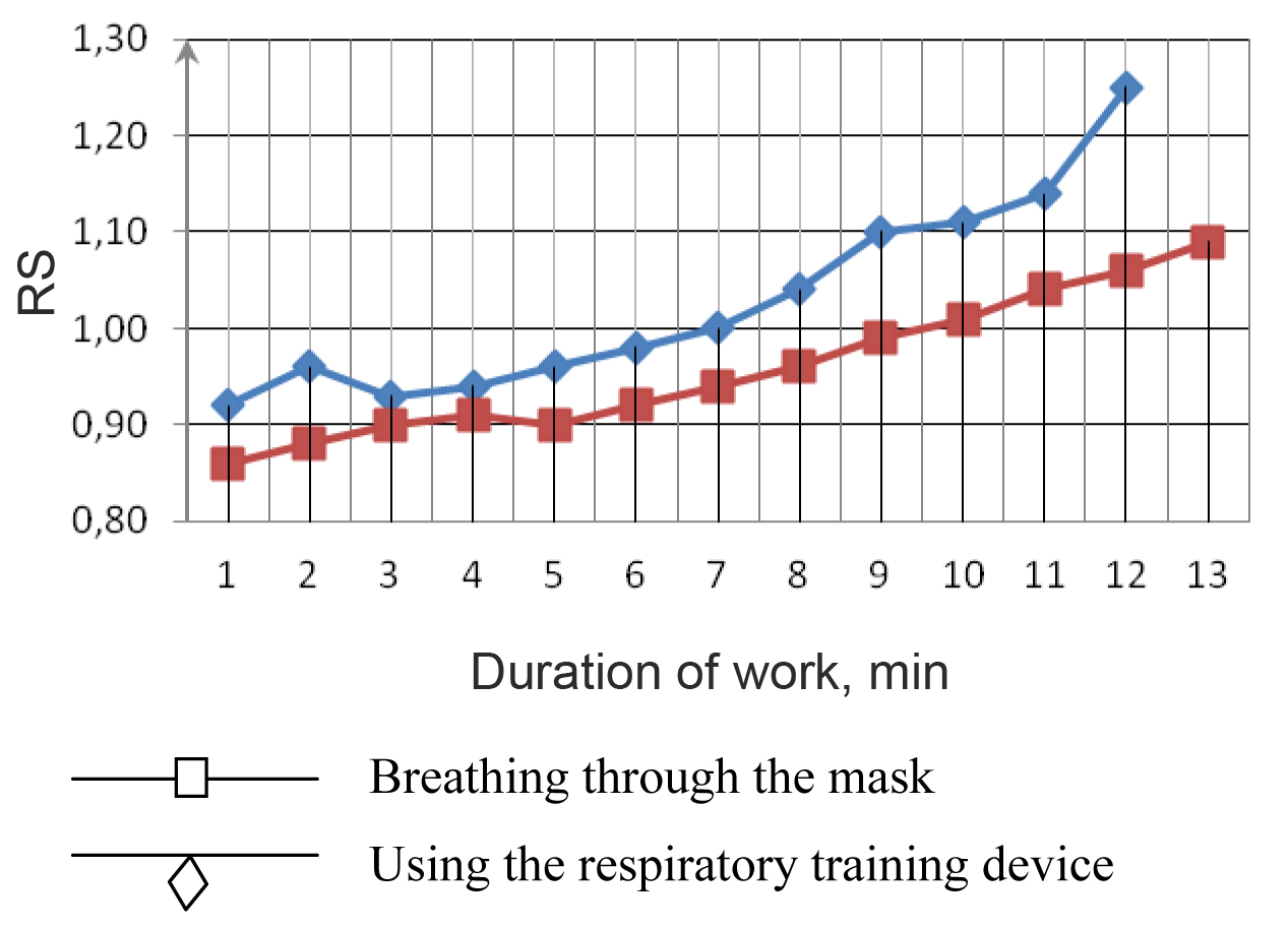 The pulmonary ventilation decrease (Fig. 4) and the increase of the oxygen-utilization coefficient (Fig. 5) at low intensity of performance of exercise when using the respiratory training device are the main reasons potentiating the functions of aerobic metabolism.