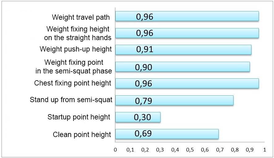 Results and discussion. The clean and jerk movement biomechanics analysis showed a certain variability of the technique in the elite sport. The statistically processed study data demonstrated the null hypothesis being wrong. Correlations between the key parameters were found to gradually grow from the starting to finishing points of the movement sequence. Only the squat phase depth was found weekly correlated with the body mass (r=+0.30), whilst every of the other seven elements were tested with the high (r=+0.79-0.90) to very high (r=+0.96) correlations between the weight movement points and body length: see Figure 1 hereunder.