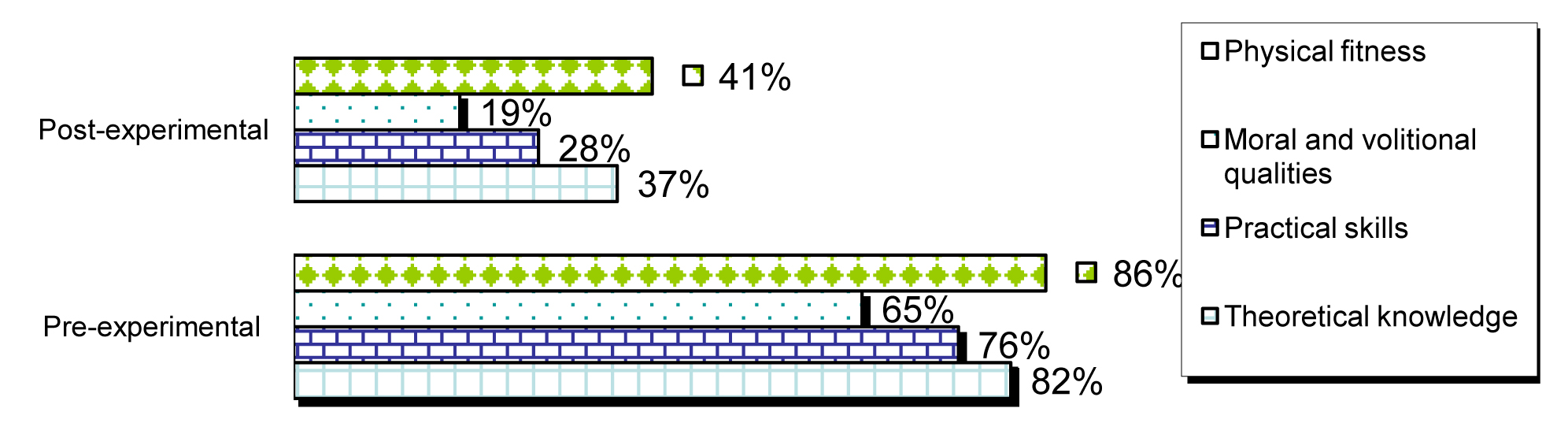 Given on Figure 1 hereunder are the summarized findings of the experiment demonstrating the following EG progress: theoretical knowledge was tested to improve from 37.0% to 82.0%; practical skills from 28.0% to 76.0%; moral and volitional qualities from 19.0% to 65.0%; and physical fitness from 41.0% to 86.0%.