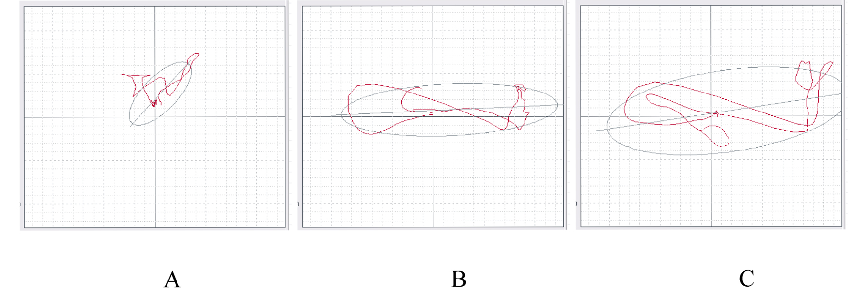 Fig. 1. Statokinesiograms when striking a kick (geri) in athletes of different sports qualifications