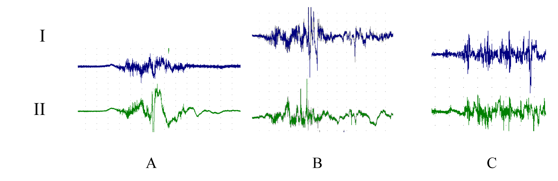 Fig. 2. Electromyogram of lower (I) and upper (II) fascicles of gastrocnemius muscle when performing a geri