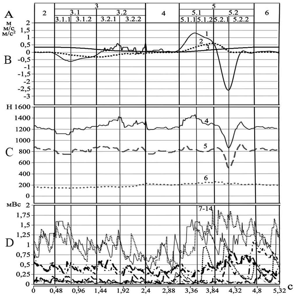 C: dynamic indices (ballistograms), including vertical strains in the pelvis segment (6), shoulder girdle (5) and summarized strain in the both segments (4);