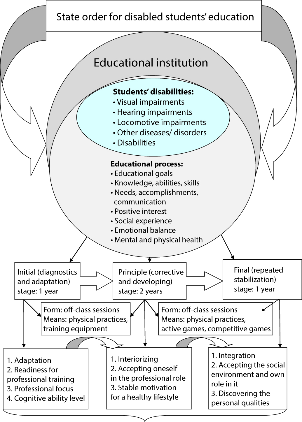 – Initial (diagnostics and adaption) stage taking 1 year and designed as a set of socializing educational actions intended to prevent, eliminate or neutralize the reasons and conditions for negative deviations in the adaptation process of students with health impairments in the new profession-focused environment of the educational establishment; with the 45-minute education sessions scheduled twice per week and run at a slow to moderate pace;