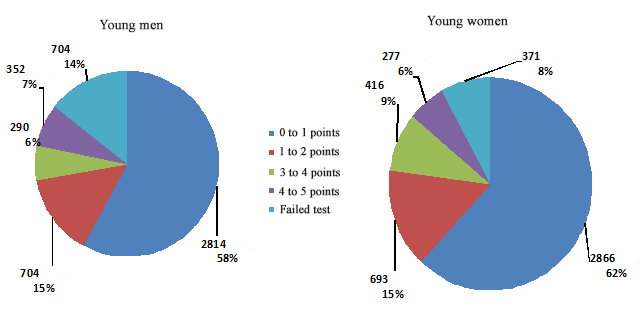 The test data obtained by the progress monitoring project included the low vital capacity and strength rates (see Figures 1, 2), with 51% of the young men and 33% of the young women tested with low vital capacity rates. Furthermore, 48% of the young men and 62% of the young women were tested with low strength rates.