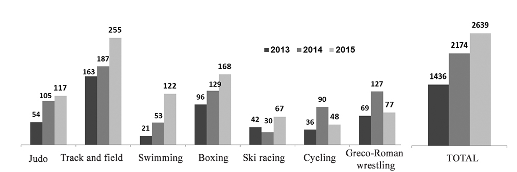 We have attained – through the relevant above-described planned initiatives and the second-stage process monitoring initiative and data analyses – certain progress as verified by the growing numbers of the skilled athletes and winners of the regional sports events. Given on Figures 7, 8 and 9 hereunder are the municipal sports progress data with the relevant growth rates. It should be noted that these activities have been designed on an uninterrupted basis and subject to permanent management and control by the Sports and Youth Policy Department of the Tyumen Municipality in cooperation with Physical Culture Institute of Tyumen State University.