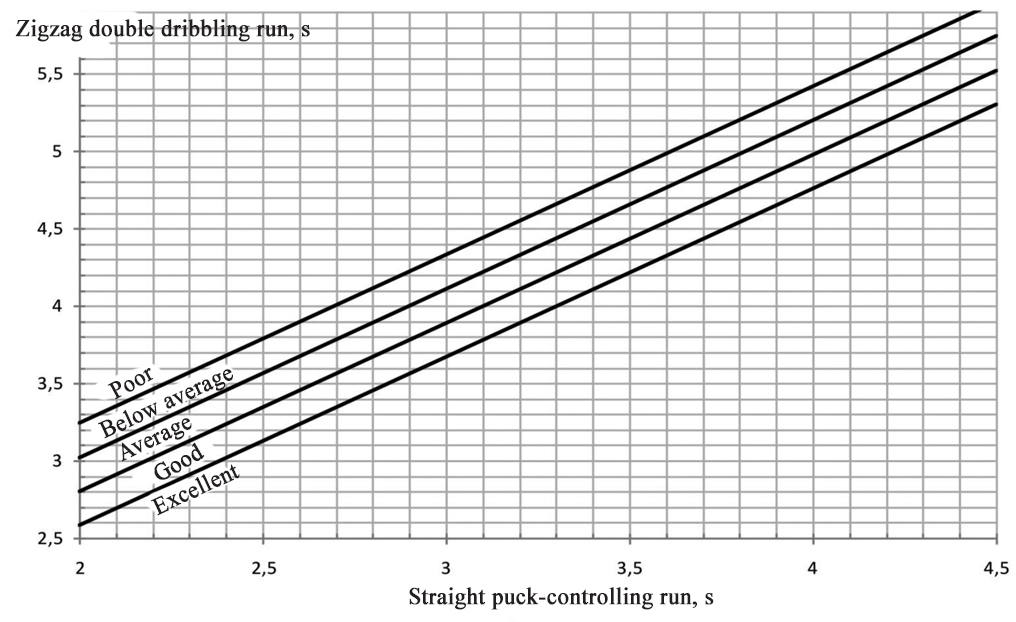Study results and discussion. The tests showed that the 16-m range was run by the puck-free player with a stick for 2.865±0.1884 s on average; whilst the puck-controlled run claimed 0.117 seconds more on average (p<0.05; puck-controlled run time is 2.982±0.2448 s). The dribbling was tested to claim on average 0.347 s more than the straight puck-controlled skating (p<0.05; dribbling skating time is 3.329±0.3114 s). The zigzag double dribbling was tested to claim 0.998 s more (p<0.05; zigzag double dribbling time is 3.980±0.4401 s). The test rates were found to be in statistically significant correlations, and this made it possible to apply a method of regression balances to work out the puck-controlling player’s manoeuvring, dribbling and zigzag run efficiency nomograms.