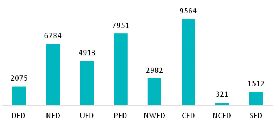 Based on the Project tests, 5236 (14.5%) and 7166 (19.85%) of the sample successfully qualified for the Association of Student Sports Clubs Gold and Silver Class certificates, respectively, and 23,700 (65.65%) failed in the tests. Most successful in the Association of Student Sports Clubs tests were the Central Federal District students (Figure 3), although the North Caucasus Federal District leaded in the numbers of certificates won (Figure 4).