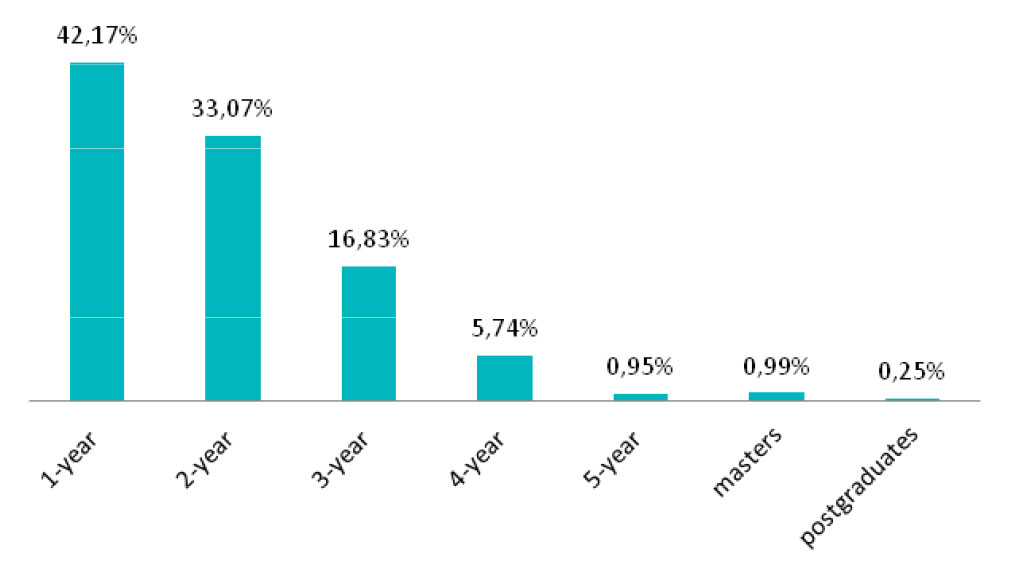 Results and discussion. Given on Figures 1 and 2 hereunder are the student competitors in the Project classified by the federal regions and age groups. Dominating in the university-level Project events were the CFD competitors (n= 9564). Leading among the universities were Belgorod State National Research University and Tyumen Industrial University (n=1567 each) followed by Ural State University of Economics (n=1268). Kazan National Research Technical University named after A.N.Tupolev came up with more than 1000 competitors. It should be mentioned that the Project competitors were dominated (42,17%) by the 1-year students: see Figure 2.