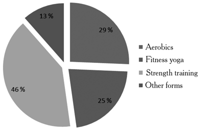 Results and discussion. The popularity of fitness has significantly increased in the recent years. According to the studies, fitness classes are interesting for everybody, and especially for young students [7]. During the monitoring we have found that 87% of female students of the preparatory department preferred variation forms of physical education classes, including recreational fitness. The greatest preference was given to: fitness aerobics - 28%, fitness yoga - 22%, classes in a gym - 37%, other forms of sports and recreational activities - 13% (Fig. 1).