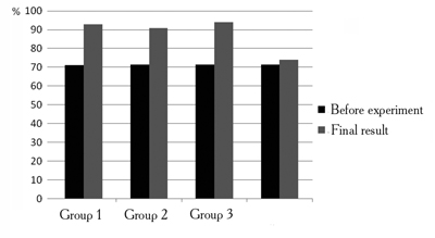 68 of female students of the preliminary group aged 17-18 years participated in the experiment. On the basis of the monitoring three experimental groups (EG) and one control group (CG), 17 people in each, were formed.