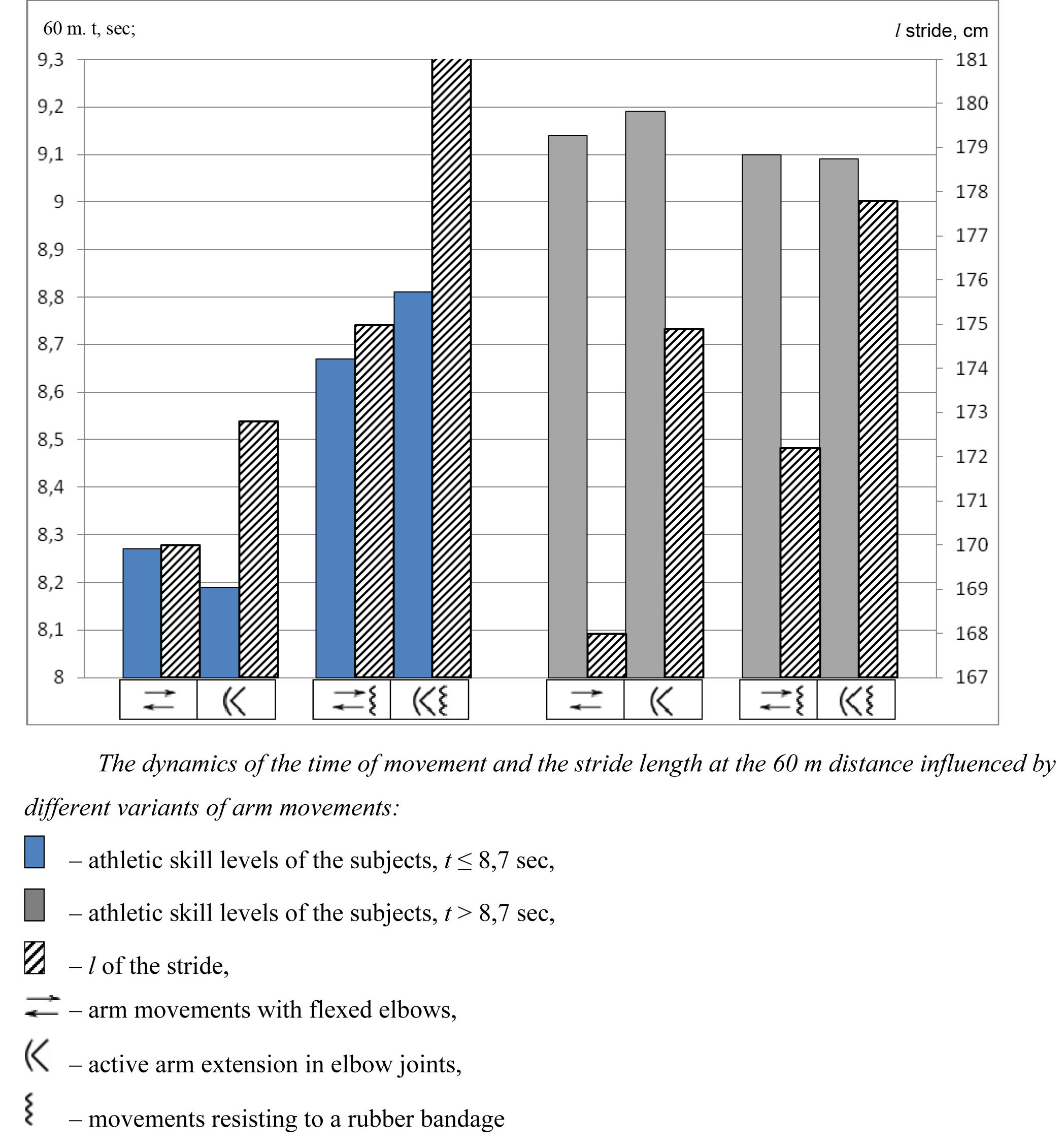 Fig. 3 shows the dynamics of the stride length and the time of running the 60 m distance under the influence of the arms work programmed in the study. The figure was made according to the factors and gradations of the dispersion complex.