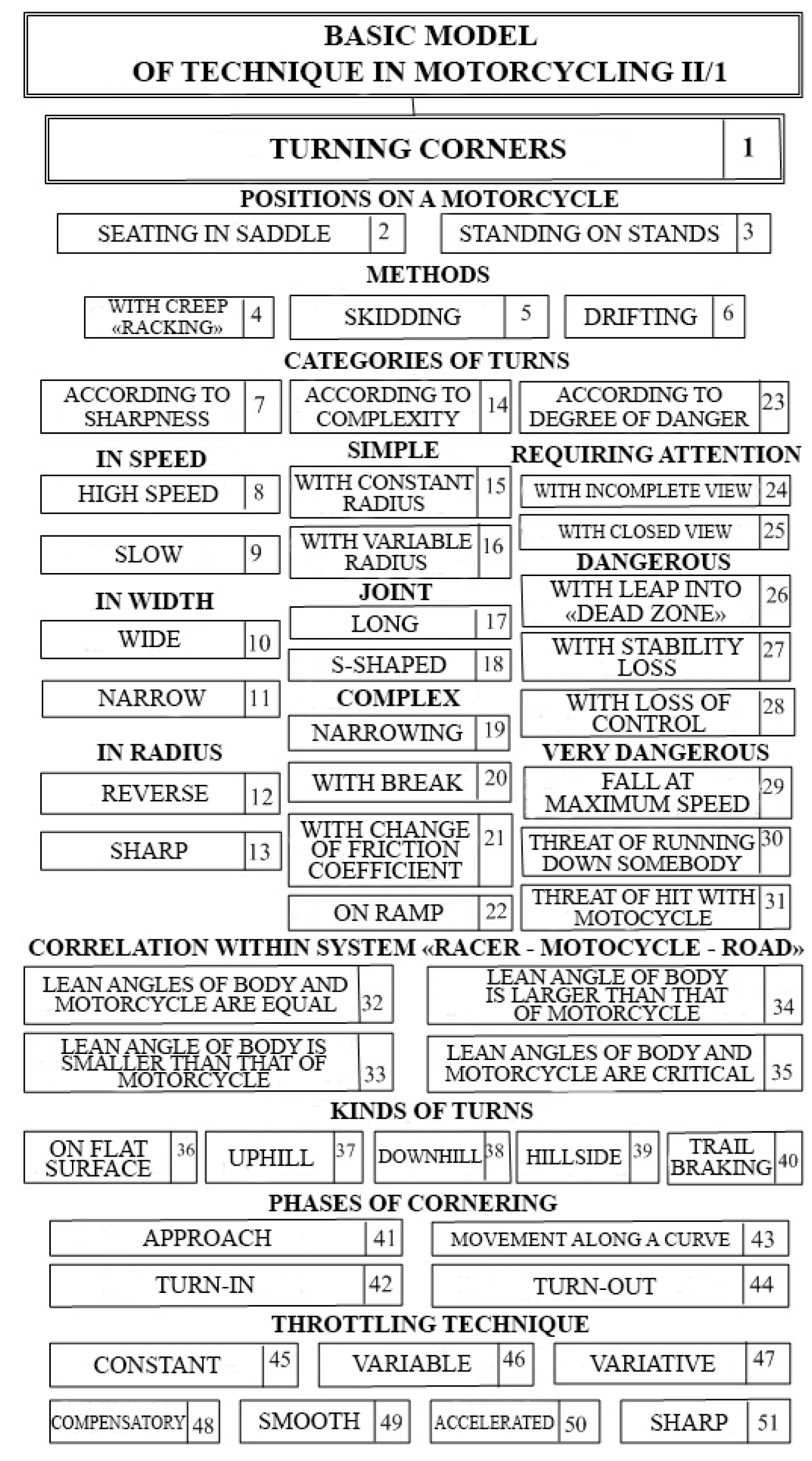 Issue state. Turning corners (1) is to be considered as the most complex element of technical skills. Racer’s position on a motorcycle is defined by the specifics of the discipline, design of motorcycle, type of road surface (asphalt, gravel, soil, snow, ice). In most disciplines seat in the saddle is the original position on a motorcycle (2). In some disciplines (motocross, speedway, enduro, stuntriding) they use the pose of "standing on stands" (3). There are the following methods of cornering such as: "with creep racking" (4), "skidding" (5). The categories of turns vary in sharpness (7), speed - "high-speed" (8) and "slow" (9) in width - "wide" (10), "narrow" (11) and in radius - "reverse" (12) and "sharp" (13). According to the complexity (14) the categories of turns are divided into simple - "with constant radius" (15) and "variable radius" (16), into joint - "long" (17) and the “S-shaped" (18), into complex - "narrowing" (19), "with break" (20), "with change of friction coefficient" (21), "on ramp" (22). The categories of turns are divided "according to the degree of danger" (23): into requiring attention - "with incomplete view" (24), "closed view" (25); into dangerous - "with leap into "dead zone" (26), "with stability loss" (27), "with loss of control" (28); and into very dangerous - "fall at maximum speed" (29), "threat of running down somebody" (30), "threat of hit with a motorcycle"(31).