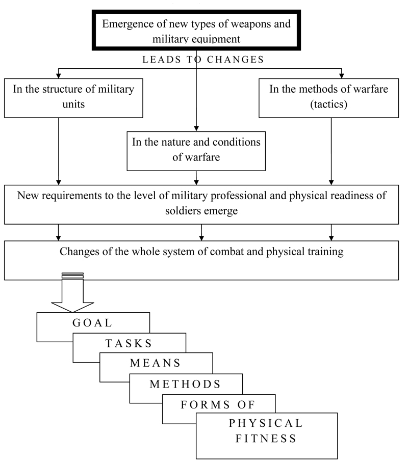 Armed forces of any country have always taken advantage of technical progress. Therefore, emergence of new types of weapons and military equipment has always led to a revision of combat tactics, changes in the structure of military units, search for new ways of teaching soldiers and adequate methods and techniques of improvement of motor skills of servicemen that maintain their physical and combat readiness (Fig. 1).