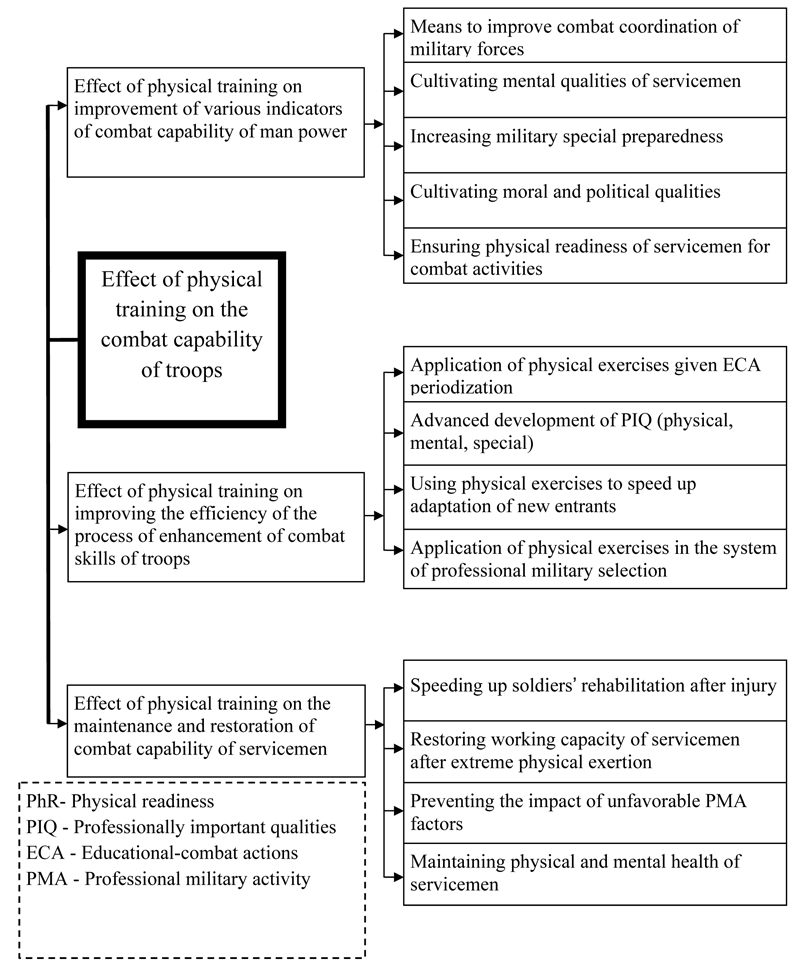 The results of research by research conducted by workers and candidates of Military Institute of Physical Culture in the last 60 years show that under the influence of physical exercises concentrated in pilot programs of physical training positive results are received in terms of improving professionally important physical and special qualities, mental personality traits, professionally-applied motor skills that maintain and increase combat capability of military personnel in various kinds and types of troops. About 500 Ph.D. and doctoral theses were defended during this period. The effect of physical exercises on various combat capability indicators takes place in many areas (Fig. 2).