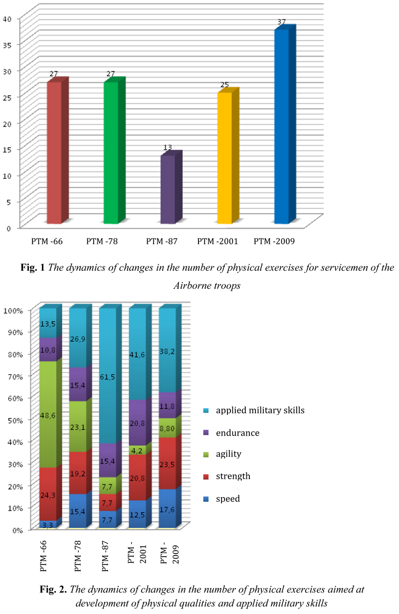 The special objectives were changed in later Manuals (PTM-78, 87, 2001) as well as the set of related exercises [4, 5, 6]. The point is that the number of agility exercises has been significantly reduced since the PTM-78, primarily due to the influence of the military-technical revolution. The emergence of new types of weapons and military equipment unduly shifted the emphasis in the views on the role of acrobatic and agility exercises that, in turn, negatively affected the attainment of the special objective of physical training - resistance to aerial sickness and shock loads on musculoskeletal system.