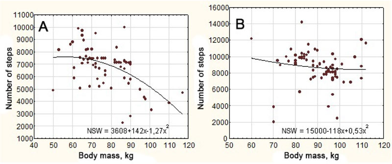 In the males, the formula of the dependency (Fig. 1, B) is as follows: NSWm = 15 000-118х+0,53х2, where NSWm = number of steps per week, 15 000; 118; 0,53 - the empirical coefficients.