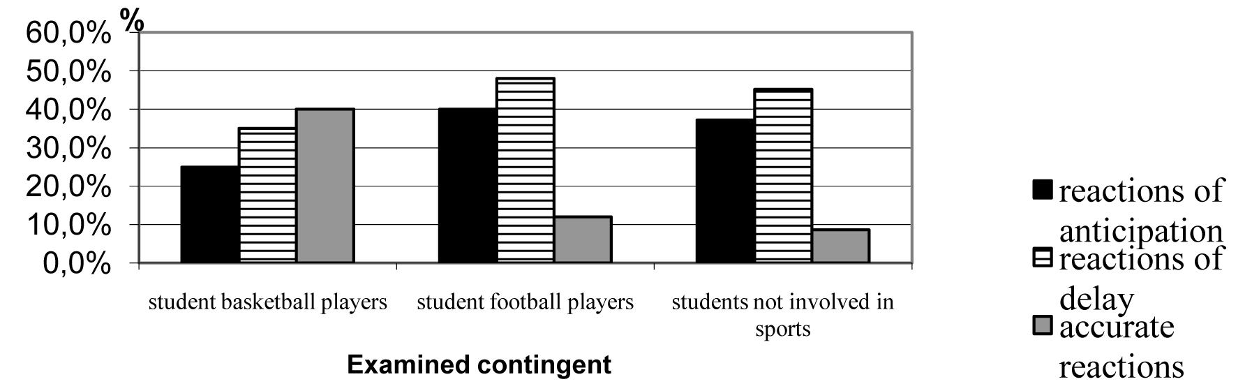 Among student basketball players those with accurate reactions amounted to 40.0% of the total of the examined students, while anticipation strategy was used by 25.0%, and delay strategy - by 35.0% of the subjects. Among student football players, reactions of anticipation were registered in 40.0%, reactions of delay - in 48.0% and only 12.0% had accurate reactions. According to the study of the balance of nervous processes based on the RMO indices, 37.2% of the students from the control group used reactions of anticipation, 54.2% - reactions of delay and only 8.6% reacted to the stimulus accurately (Fig. 1). As seen from the comparative analysis, the number of those with accurate reactions and optimal balance of nervous processes is the highest among student basketball players. This is particularly important for athletes engaged in team sports, who constantly find themselves in situations of quick reactions to ever-changing conditions, the complication of which is determined by multiple alternative choices and strictly limited time allowed for decision making.