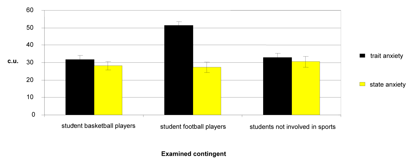 The analysis of the Spielberg-Hanin test results of the examined student basketball and football players revealed that the level of trait anxiety in football players was significantly higher than in the rest of the examined groups (51.3±2.1 c.u. versus 31.8±2.5 c.u. in basketball players and 33.1 c.u. in students not involved in sports, р<0.01) (Fig. 2). State anxiety in student basketball and football players was at a low level and had no significant differences (28.3±2.4 and 27.4±3.0 c.u. respectively).