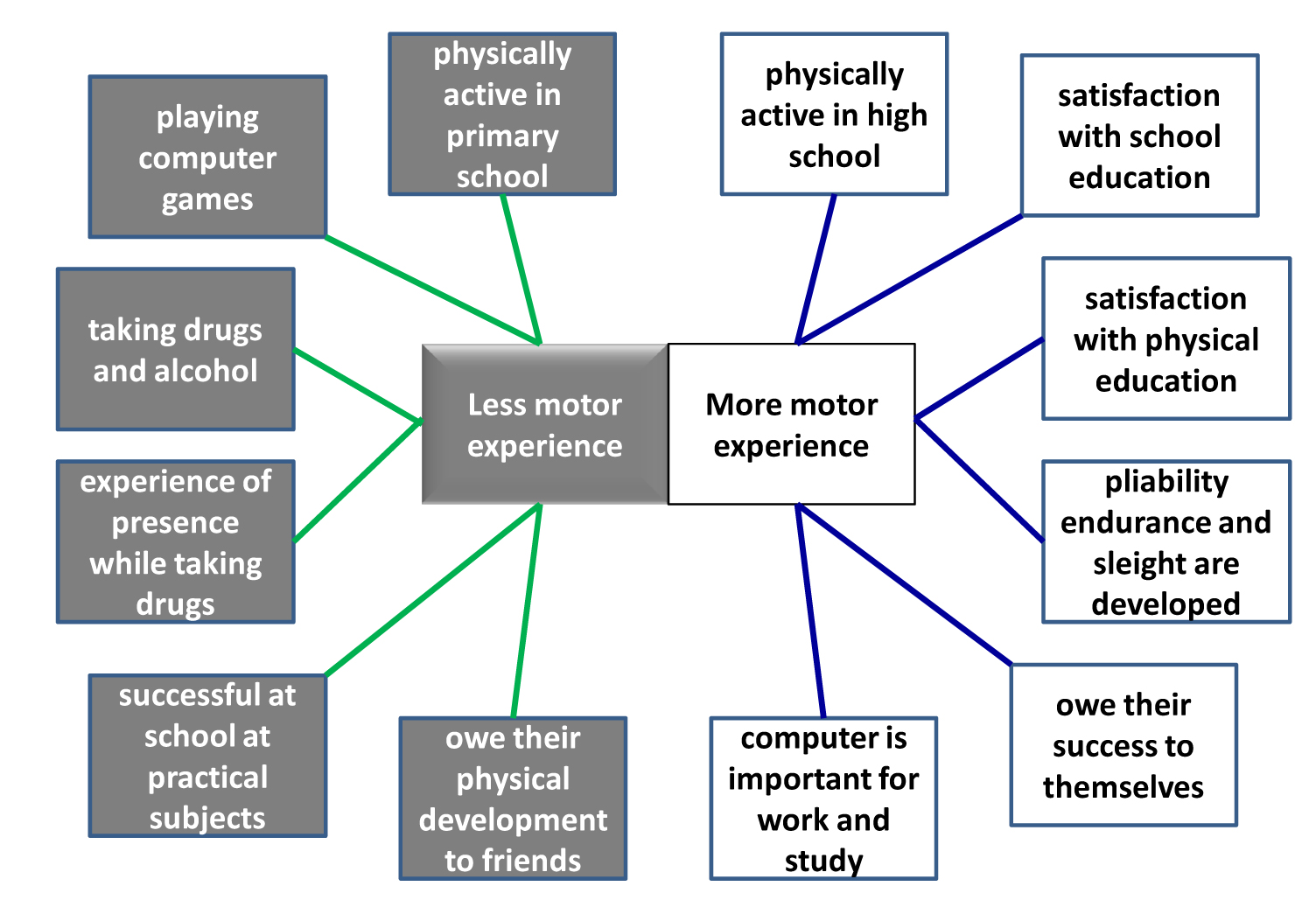 Results and discussion. The relationship between the answers, characterizing motor experience of the interviewers, and the answers which reflect the part of school and teachers in their physical development, was defined using the correlation and regression analyses. The core link with the maximum number of connections was assessment of school education. Those students who are generally not satisfied with school and teachers, who were motor passive during the school years and, particularly, in high school, are not satisfied with their physical development as well. Dissatisfaction with school education also correlates with the fact that school is considered to be the reason of life failures (P<0,05). From the other side dissatisfaction with school physical education and motor passivity in high school are connected with the statement that exactly school and teachers are responsible for starting smoking and taking drugs.