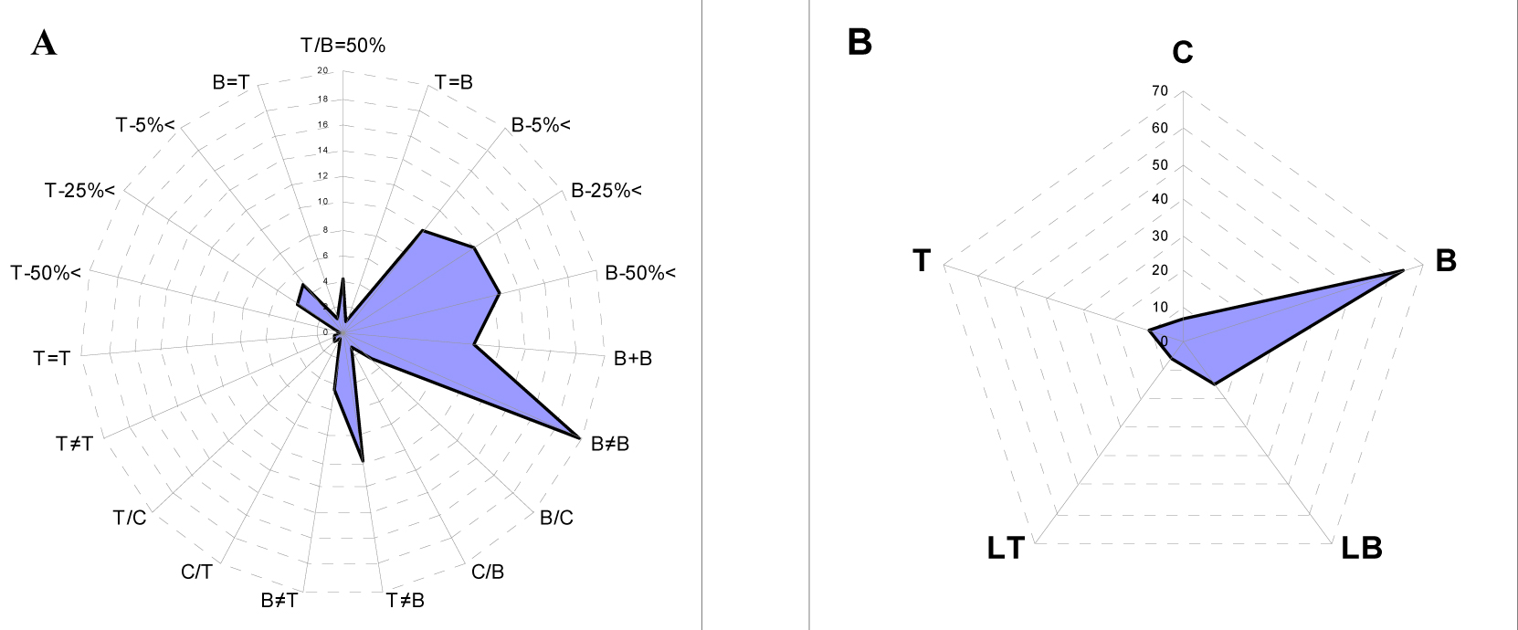 LB-factor: lability, or extension (asymmetry), combinations of FDR properties towards B-factor (%). For example, in the first FDR combination C-factor or T-factor (%) dominate, while in the second combination B-factor (%) dominates.