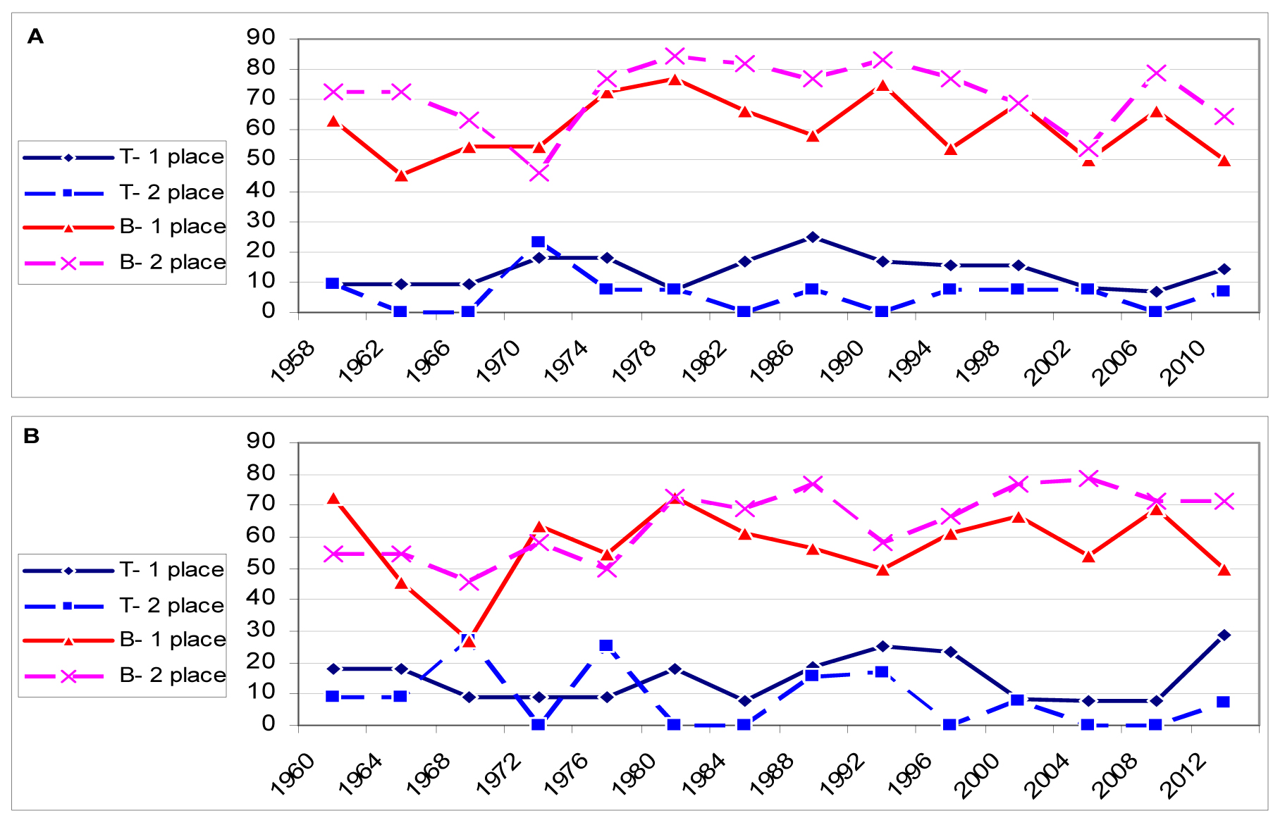 The third phase was devoted to a more in-depth study of the effective impact of he genotypic FDR on the successful activity of the leading world football teams and elite football players. For this purpose we identified team profiles of FDR of the finals of the world championship (WC) and the UEFA European football championship (EURO) for the last 50 years (28 finals) for the period when the national team of the USSR began to take part in the World Cup (1958) and the European (1960) Championships (Fig. 2). The main stable and significant differences between the first and the second places were established in the areas of factors of T and B (Fig. 2).
