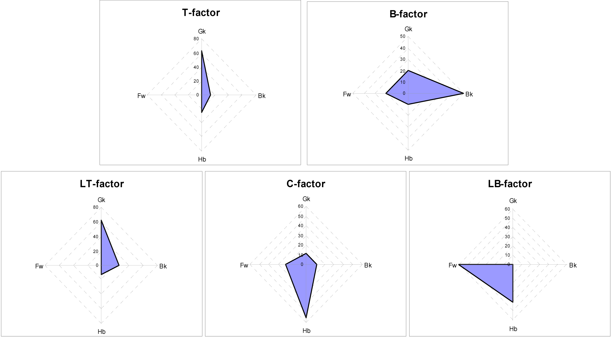 It should be noted that combinations of FDR compounding T and LT- factors, are lacking among all studied forwards (963 persons) and combinations of the LB-factor are lacking among goalkeepers (523 of people) and fullbacks (1462 people).