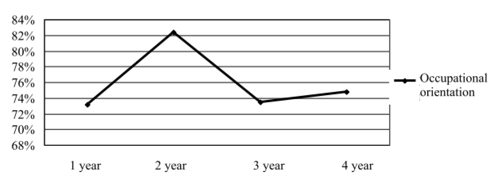 While the 1st year students still have a chance to improve in the course of study, the 3rd and 4th year students are to go through internship and probation periods, when they have to demonstrate their occupational ‘creditworthiness’ to themselves, their tutors, superiors and peers. More often than not, they feel uncertain about their occupational knowledge, experience lack of occupational experience, and complain of low stress tolerance. Less than a half of the 3rd and 4th year students had a standard level of occupational orientation.