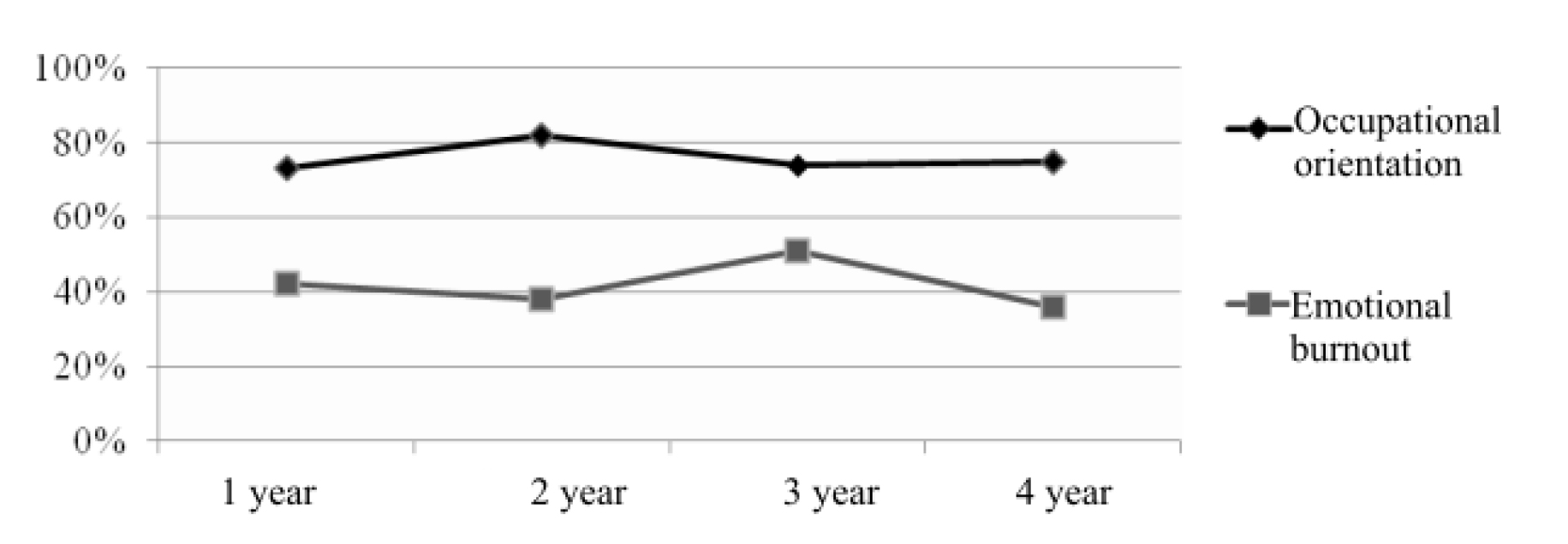 Comparing the questionnaire results with the current resistance levels seen as a component of the students’ emotional burnout (Fig. 2), one can see an inverse relationship between the indicators. Positive dynamics of the occupational orientation levels results in reduced impact of the burnout syndrome. The trend is evident for the 2nd and 4th year students, which supports our hypothesis.