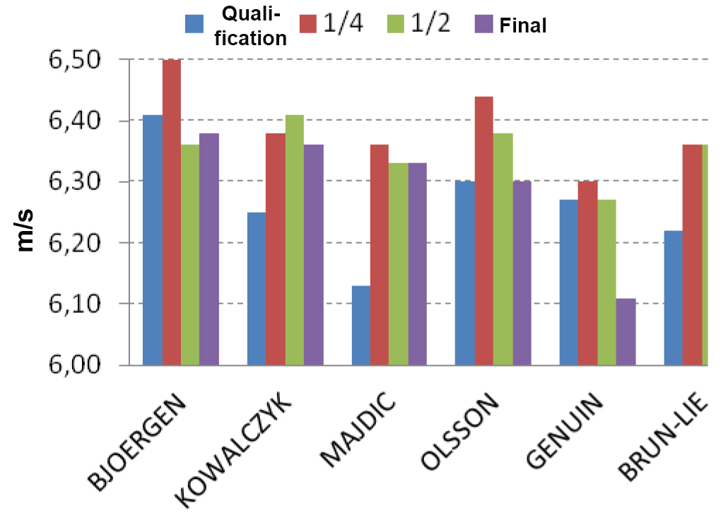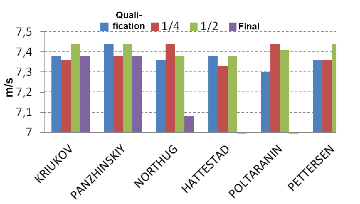 The highest distance speed at the OG-2010 was fixed in the men’s semifinal race (7.41 ±0.02 m/s) and in the women’s quarterfinal race (6.4 ±0.08 m/s). At the OG-2014, the highest speed was achieved in the qualification race both by the male (8.53 ±0.04 m/s) and female (8.43 ±0.01 m/s) finalists.