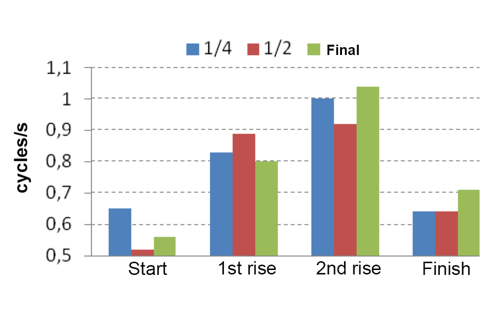 It was further found by the study that the average group movement frequency rates at the OG-2010 were on the rise from the quarterfinals to finals and reached the top levels in the final races (1.21 ±0.07 cycles/s for the women; and 1.14 ±0.01 cycles/ s for the men). At the OG-2014, the average group movement frequency rates in the women’s ski races reached their peaking values in the semifinals (0.78 ±0.06 cycles/s), whilst in the men’s races they were the highest in the quarterfinal race (0.76 ±0.09 cycles/s).