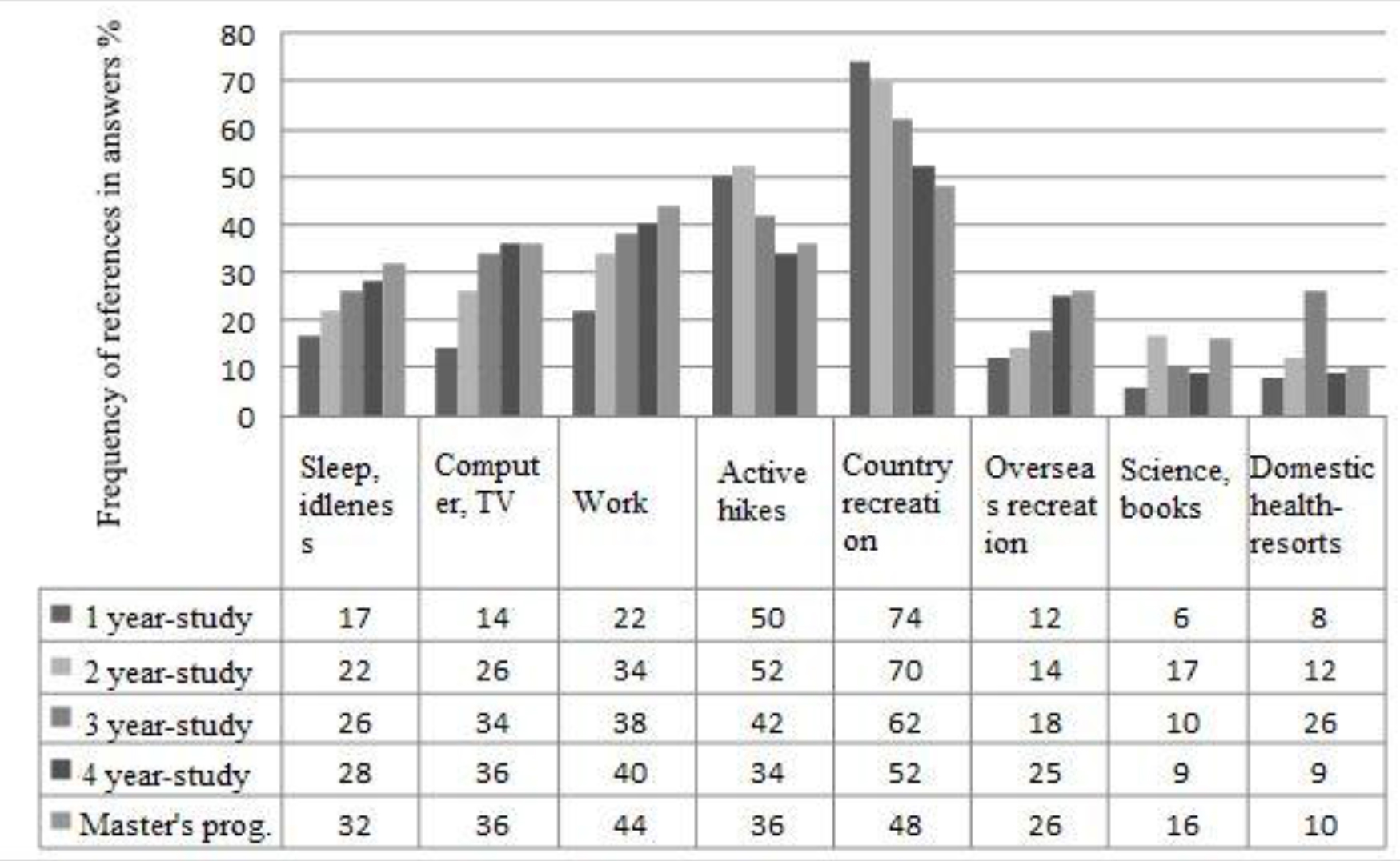 Differentiation of indices by particular years of study (Fig.2) revealed the key trends in priority recreation variation. Demand for country recreation, all forms of active tourism, such as sports hikes, decreases. Herewith, the opportunities for overseas trips increase. No specific tendency is observed regarding the indicators of recreation at domestic health resorts, but the values make us wonder about poor domestic tourism opportunities for young people. Year after year active forms of recreation are substituted by more passive ones, along with the increasing number of employed students.